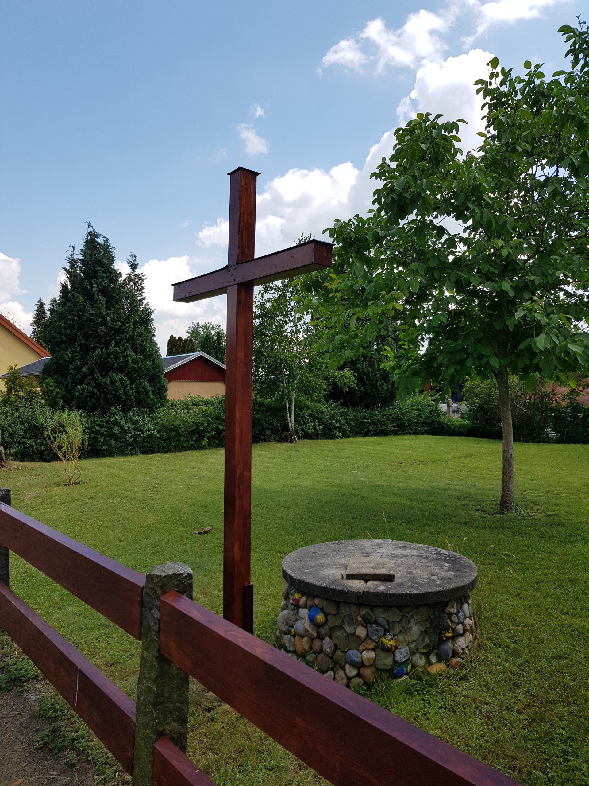 Das große Holzkreuz haben Gemeindeglieder vor einigen Jahren von der Hauptkirche in Königsbrück nach Laußnitz zum Gottesdienst herausgetragen und neben dem Kirchgemeindehaus aufgerichtet.