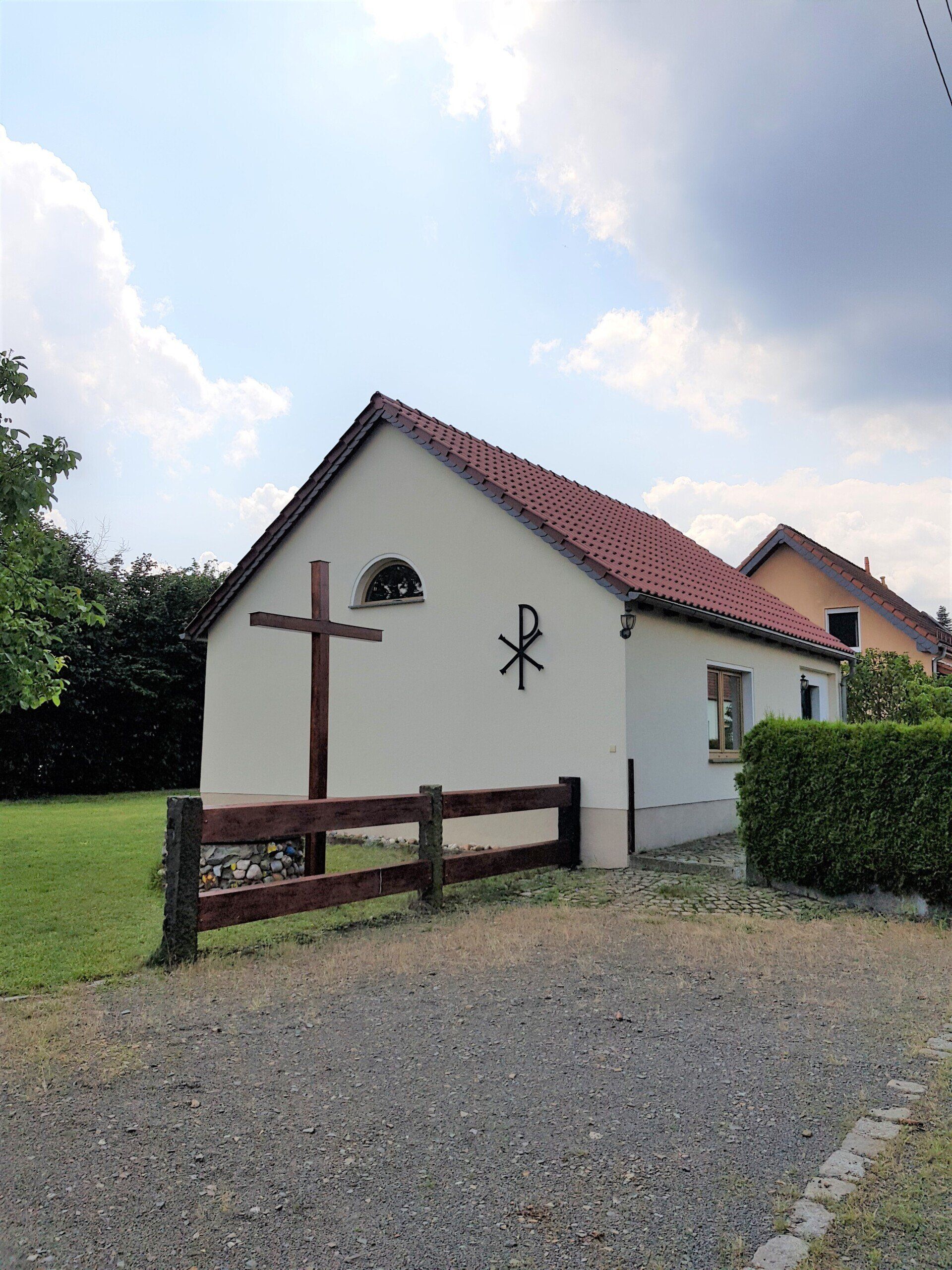 Es steht an der Thälmannstraße auf einem Gartengrundstück unter Einfamilienhäusern und ersetzt seit etwa 20 Jahren eine abgerissene hölzerne Kirchbaracke.